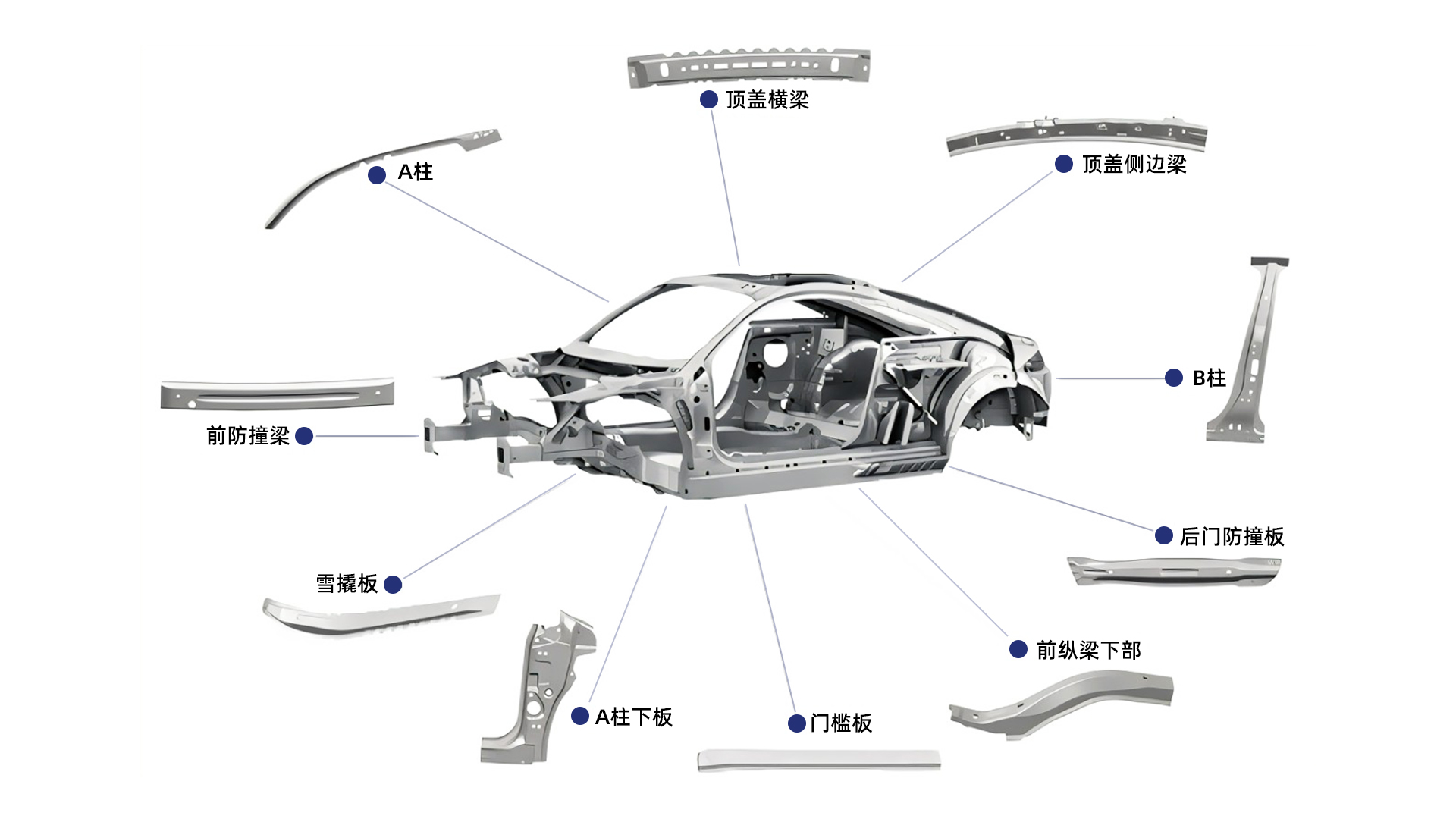 可應(yīng)用于汽車A/B柱、前后防撞梁、縱梁、座椅滑軌、門檻加強(qiáng)板等幾十種汽車零件的加工。